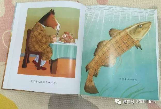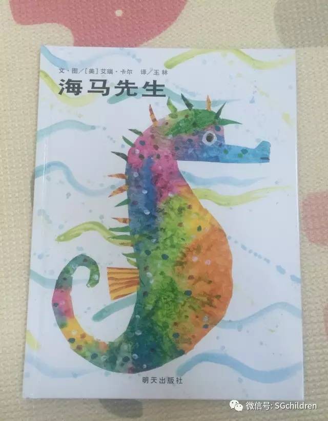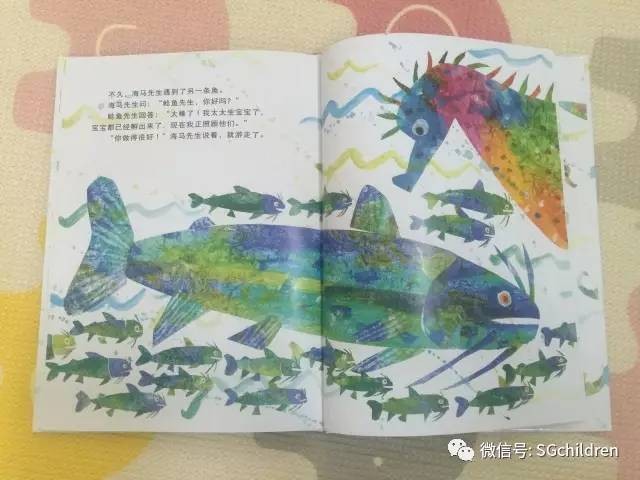 第二本是美国剪贴画大师艾瑞· 卡尔绘著的《海马先生》,动物是艾瑞· 卡尔绘本中常见的主人公,这本绘本从海洋生物的角度出发,着重塑造了海马、刺鱼、罗非鱼、钩鱼、海龙和鲶鱼等由“父亲”照顾宝宝的鱼类,以此推及对父爱的礼赞!绚烂的画风、强烈的冲击、独特的视角、创新的材质,综合构造出一种新颖的阅读感受,在文风方面,作者秉承了一惯的带有重复情节的写法,让孩子们在熟悉中又有一点点新鲜感。