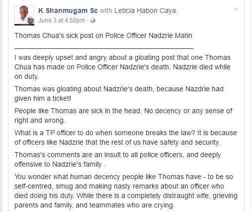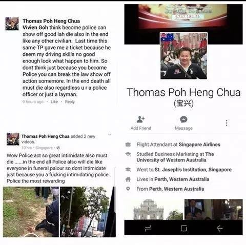 一个号称自己是“新航空少”的网民,在facebook上对于殉职交警大放厥词,被新加坡内政部长尚穆根发文怒怼,结果就在昨天(6月4日),他因为偷东西被抓了!果真是“多行不义必自毙”!