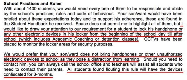 他儿子今年在英华学校(巴克路)读中二。新加坡所有中学都有明文规定,学生如果在学校玩手机,只要被老师看到,都会被没收手机;而英华学校(巴克路)则规定,手机会被没收3个月。这点,在开学的时候,已经广为告知学生及家长,大家都知道。