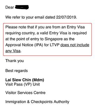 ICA给出的回复是:“如果你是来自需要办理签证的国家,在入境新加坡时需要准备有效的入境签证。而长期访问准证的批准信不包括任何签证。”