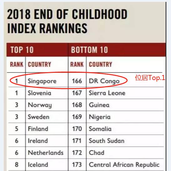 在175个国家中,新加坡与卫冕冠军斯洛文尼亚并列第一,1000分的总分新加坡获得了987分,这表明孩子可以在新加坡有个美好童年!