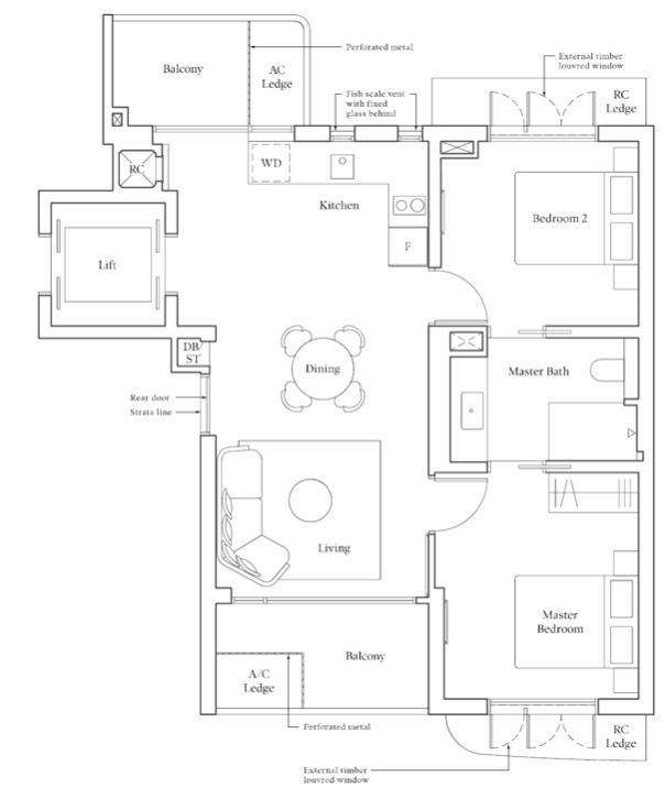 二卧室,套内面积60-75平方米(646–807平方尺),整套售价从S$1,150,000元(Heritage)、S$1,190,000元(Horizon)和S$1,474,000(Peak)元起。特点是户型方方正正,餐厅、客厅和厨房整合在一起,布局合理,无浪费空间。有些二卧室单元配备2个开发式阳台,而有些则配备1给全封闭式阳台。主卧室可放置King Size的大床,配备衣柜,普通房也可放置双人床。拥有私人电梯。这样的户型非常适合有个小孩的夫妻,以及专业人士和学生,也适合喜欢与父母同住的年轻夫妇。除了自住,也适合出租给相应的高端专业人士。