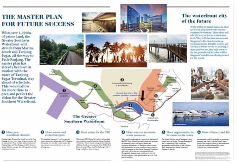 新加坡南部濒水地区(Greater Southern Waterfront)覆蓋我国南部海岸线30公里,从滨海东花园一直延伸至巴西班让,面积约2000公顷,是滨海湾的六倍,相当于两个榜鹅新镇。