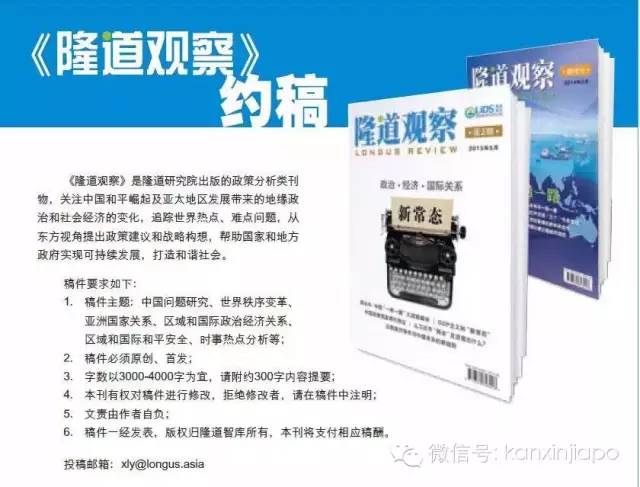 政策分析类刊物《隆道观察》由注册于新加坡的隆道研究院出版,关注中国和平崛起和亚太地区发展带来的地缘政治和社会经济的变化,追踪世界热点、难点问题,从东方视角提出政策建议和战略构想,帮助国家和地方政府实现可持续发展,打造和谐社会。《隆道观察》定价每期$10新币,如需订阅可写email至[email protected],留下您的姓名,电话和邮寄地址,将有工作人员与您联络。