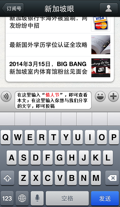 1.通过发微博,@新加坡眼 投稿。 2.写邮件到[email protected] 投稿。 所有投稿将同步更新在本图文信息内与网友分享,默认为实名投稿,如需匿名请注明。本文将实时更新至2月14日晚上12:00。活动结束后将评选出一对与我们分享最精彩爱情瞬间的情侣,由尚影达摄影工作室免费送出价值$1800情人节高端定制写真(情侣写真/婚纱套系)。附照片的投稿可增加中奖概率。获奖者由网友选出。欢迎扫描本文最后的二维码加评选群。