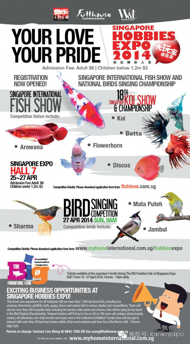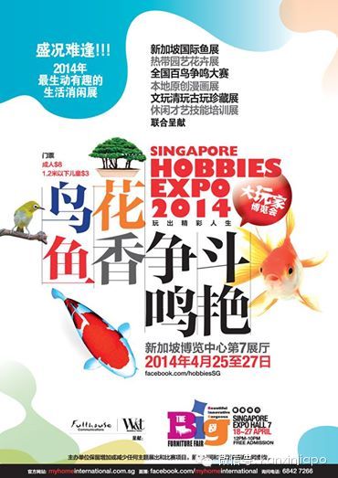 新加坡首届“玩出精彩人生”大玩家博览会于4月25日-4月27日在新加坡博览中心举办,展览分为“国际鱼展”“百鸟争鸣”“本地原创动漫”及“古玩珍藏”四个主题,不失为周末轻松消闲好去处。