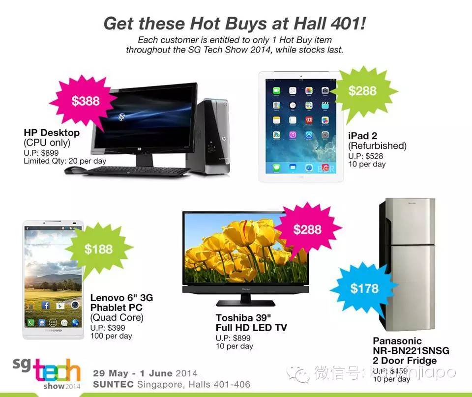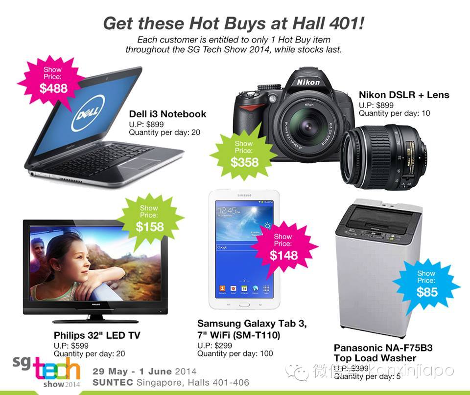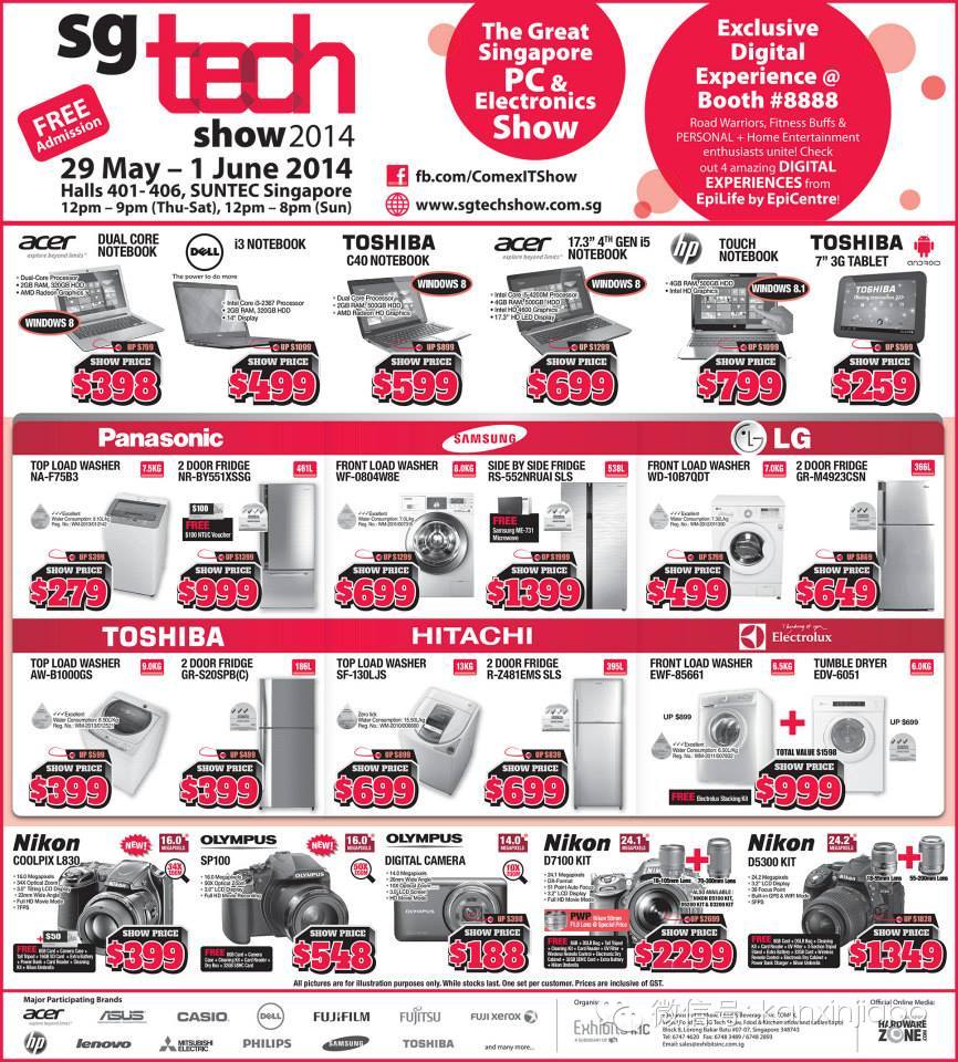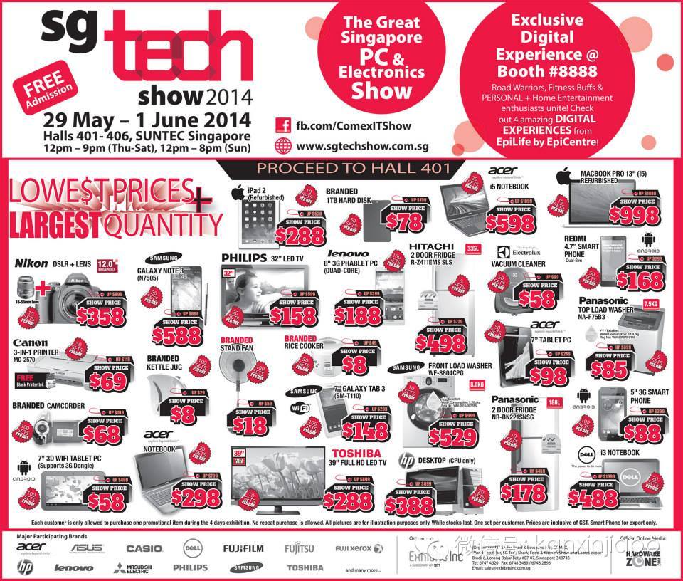 2014 新加坡 Tech Show 于5月29日至6月1日在新达城举办,届时将有Acer, Asus, Casio, Dell, Fujifilm, Fujitsu, HP, Lenovo, Philips, Samsung, Toshiba等品牌的各类产品参展。