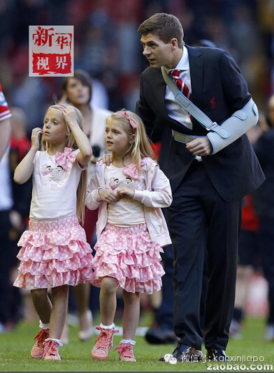 2013年5月19日,英格兰球员杰拉德在英超一场比赛后带着两个女儿走在球场里。