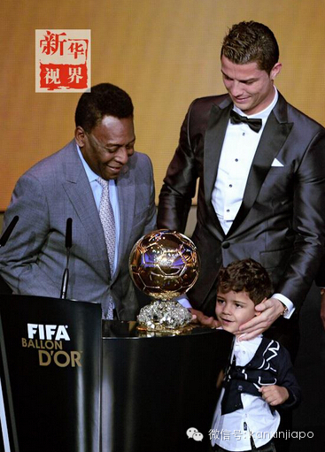 2014年1月13日,葡萄牙球员克里斯蒂亚诺·罗纳尔多(上右)在获得2013年度金球奖后与儿子小克里斯蒂亚诺·罗纳尔多(下)上台领奖。