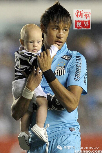 2012年4月19日,巴西球员内马尔在南美解放者杯的一场比赛前怀抱儿子卢卡。