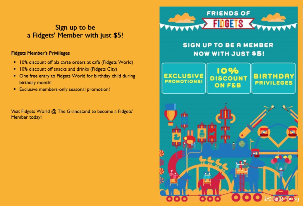 除了上述这些,还有若干个活动室,可以举行生日会,主题趴之类的,如此轻松的消磨一天时间,出来以后随便找个餐馆或者食阁解决一下晚餐,然后再去Giant买个菜,最后愉快的回家,我想爸爸妈妈们应该都很心动吧。事实上Grandstand还有其他可看的地方,待我一一探秘来,先来看看Fidgets的价格吧,作为一个超级游乐场,这里可以说是价格相当实惠,还可以花5块钱申请一张会员卡,享受比较实惠的折扣和生日月份的免费入场,或者购买99元/199元配套,详情查看主页:http://www.fidgets.com.sg/