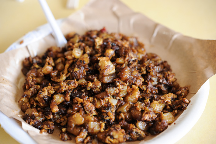 无需解释。用油量极高(否则怎么炒得出那诱人镬气?),脂肪量高(38g),而且其中70%是饱和脂肪和胆固醇。所用的大量甜酱、腊肠和猪油渣也都不是省油的灯。含钠量高达1459mg