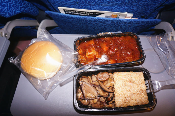 ↓机上两份饭,24新币,消费真心高啊。好在味道不错,新航餐饮是出了名的好,所以酷航也差不到哪去,甩了亚航N条街。