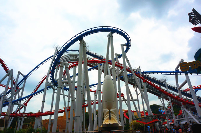 ↓世界上最高的双轨过山车。蓝色轨道最为刺激,背挂式,可惜没拍到。