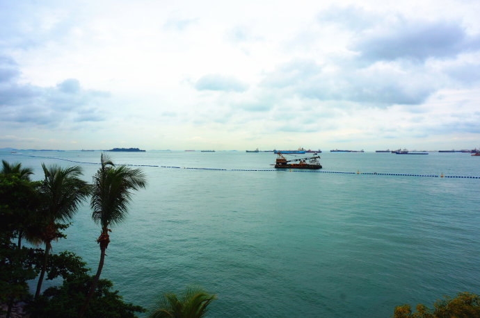 ↓转过身来向南边望去,海的那一边应该就是印尼了。海里有这么一条看不到两端尽头的漂浮物标记线,想知道这是国际线划分新加坡和印尼的吗?要不然是啥嘞?求科普。