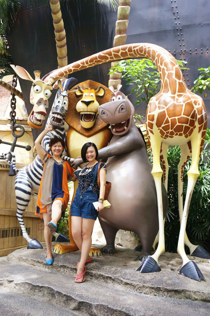 ↓马达加斯加区,最适合小朋友玩的区域。梦工厂动画的卖座巨片马达加斯加的四个主角——狮王亚历克斯、斑马马蒂、河马格洛丽娅和长颈鹿麦尔曼,和他们一起开启木箱漂流的趣味探险之旅。