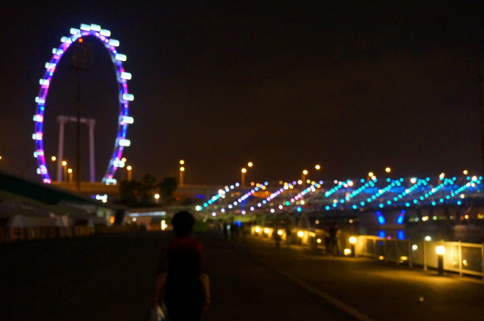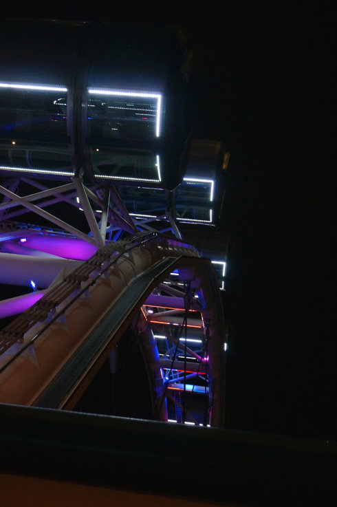 ↓新加坡摩天轮高165米,大约42层楼那么高,超过了英国伦敦眼130米的高度。据说可在上面眺望到45公里外的景色,包括印度尼西亚的巴淡岛、民丹岛,以及马来西亚的柔佛州。反正我没看到。