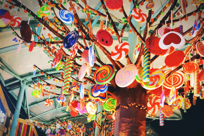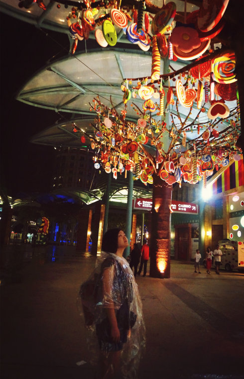 ↓晚上7点多的时候下起了暴雨,本想看八点整的烟火表演也没戏了。好在环球影城该玩的基本都完成了,出来后去门口的糖果世界逛逛。
