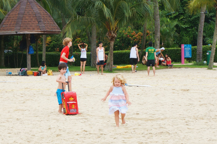 ↓这个海滩上能看到的要么就是金发碧眼的老外,要么就是新加坡本地人,彻底度假的方式,晒太阳打排球。偶尔经过几个扛着相机凹完造型就闪人的中国人,哈哈,我们也拍完了,闪人。