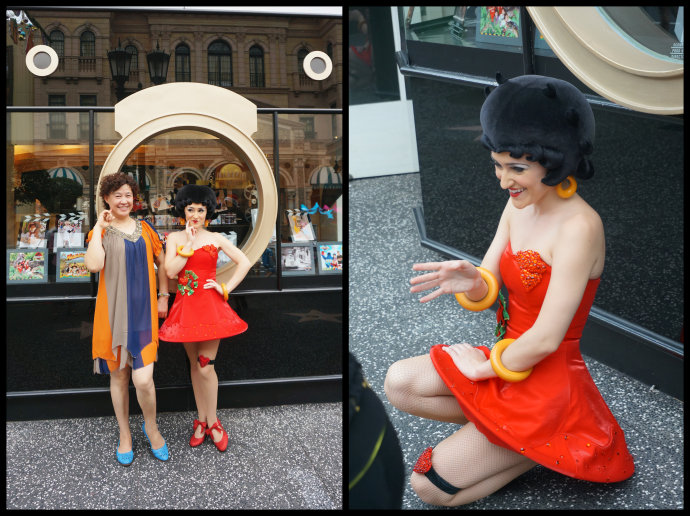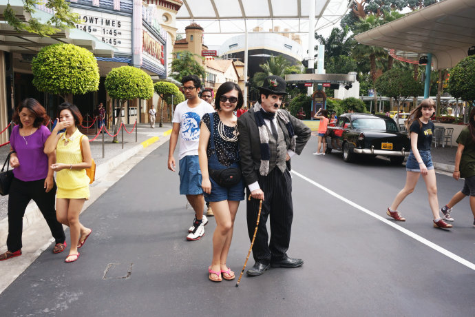 ↓好莱坞区。两旁都是百老汇风格的经典建筑,排列种植了棕榈树,还有真人扮演的好莱坞电影中的经典人物。