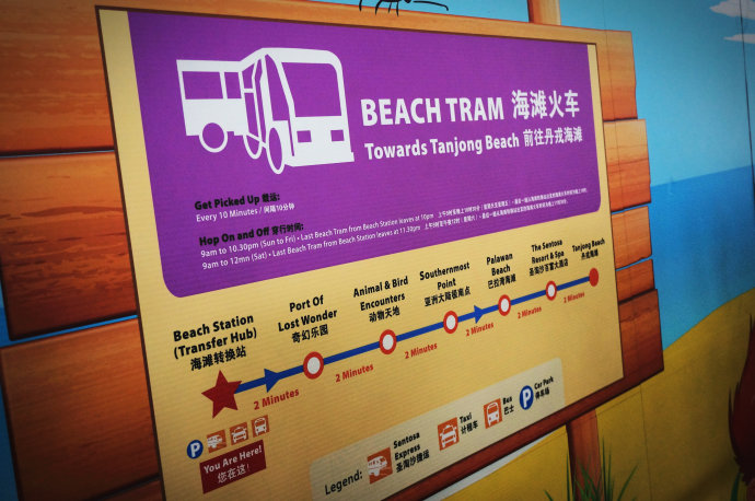 ↓岛上有这种免费的捷运车可搭乘,时间充裕的话最好选择步行,因为圣淘沙真的很好逛。下面是站牌和捷运车的样子。
