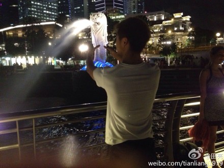 在新加坡的标志性景点鱼尾狮旁边,他又发微博给森蝶:“女儿啊,爸爸想你可又回不去家,想来想去,给你抓条鱼吧。这次爸爸没下水,站岸上就抓zao了,这鱼长个大狮子头,超级可爱还会喷水