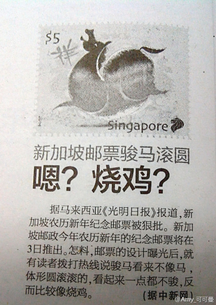 新加坡2014年推出的马年邮票被中国马来西亚等地媒体和网友取笑像个肥滚滚的烧鸡,成为一时笑谈。虽然有专业网友指出,中国传统里,宋马瘦,唐马肥。肥马并非毫无根据。