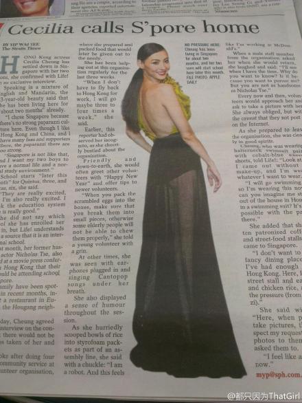 为什么张柏芝频繁出现在新加坡呢?1月7日,网友@都只因为ThatGirl 在报刊上看到关于柏芝的采访报道,找到了答案:“怪不得最近经常有人看到张柏芝,原来她已经移居新加坡了,她最近经常去做义工,给穷人派发食物什么的,她喜欢新加坡因为这里没有狗仔时刻跟踪她,而且教育体系很棒所以把儿子带到这面上学。@新加坡眼”。