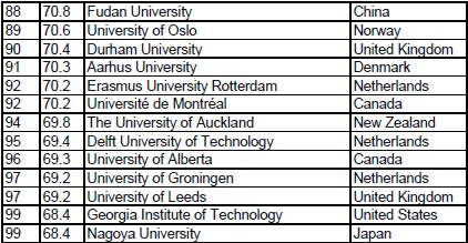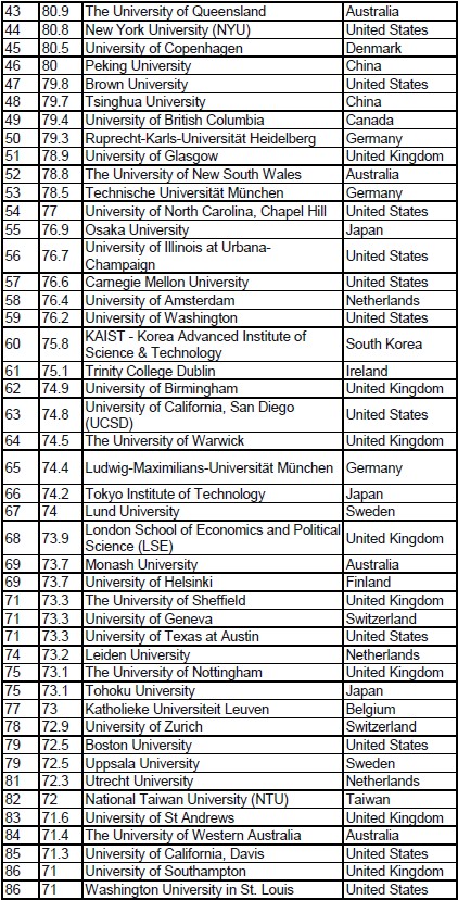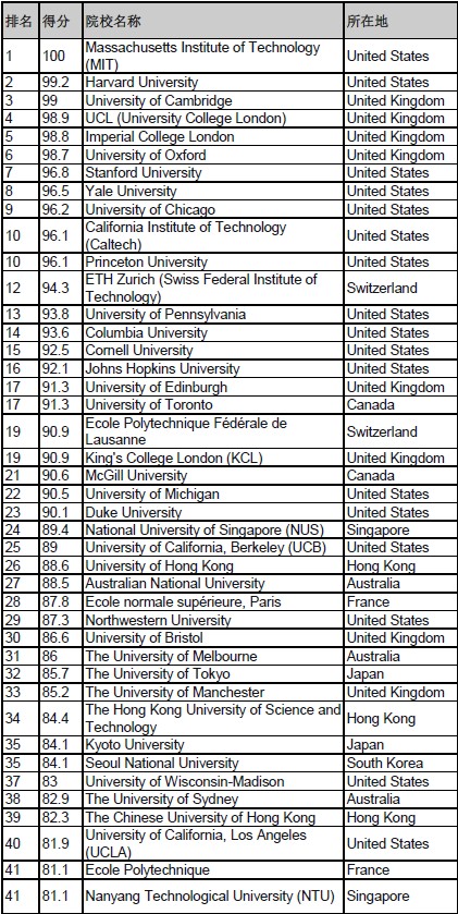 中国两所名校北大清华则分别排在46及48位,复旦大学排名88位。