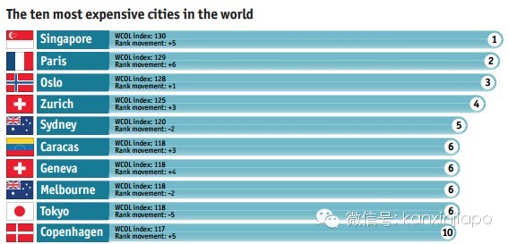 新加坡是因为新元走势强劲,再加上拥车昂贵,公用事业费居高不下,而稳坐榜首;此外,新加坡不仅基本的生活费昂贵,就连喜欢打扮的时髦一族在购买衣服时也得三思,因为乌节路的名牌衣服价格也是全球最贵的。继新加坡之后,巴黎是第二最贵的城市,接下来是奥斯陆、苏黎世和悉尼。去年全球最昂贵的城市冠军东京,今年或因日元贬值而下滑至第六名。