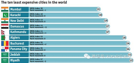 生活成本最低城市主要分布于亚洲。调查报告结果显示,孟买由于其低廉物价、供应充足,且部分商品享有政府补贴减免,成为全球生活成本最低城市冠军。