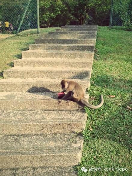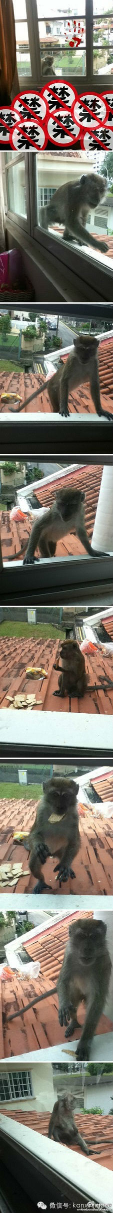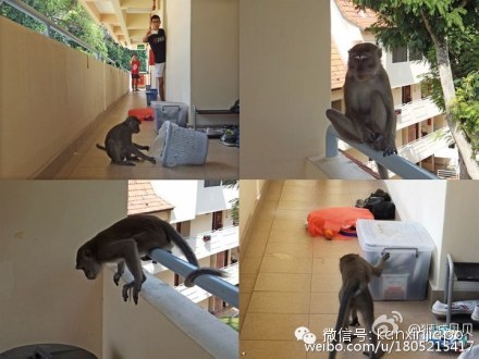 同学拍的,所以猴灾已经从乔治王子公园区宿舍蔓延到了爱德华国王七世宿舍了。同学奇葩的遭遇:对着窗口写作业然后猴子爬上六楼坐在她的书桌上跟她对视几秒之后,淡定地拿起她桌上的薯片,拆开吃了几口,然后放回原处。然后同学终于回过神儿,飞快地跑出了房间求救…… (@狮城贝贝)