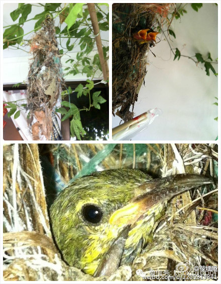 舅妈家在兀兰,最近她的阳台住着一户很特别的住户。也许是被阳台的绿意所吸引了,或是树林砍伐太严重的结果,连鸟儿都得在组屋区里筑巢育幼。小鸟张大嘴等食物的样子可爱极了。(@筱媔飏)
