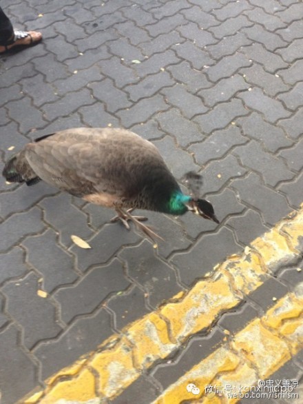有只孔雀在新加坡动物园外,在排队打车处。求帮它,谢谢(@忠义善凉)