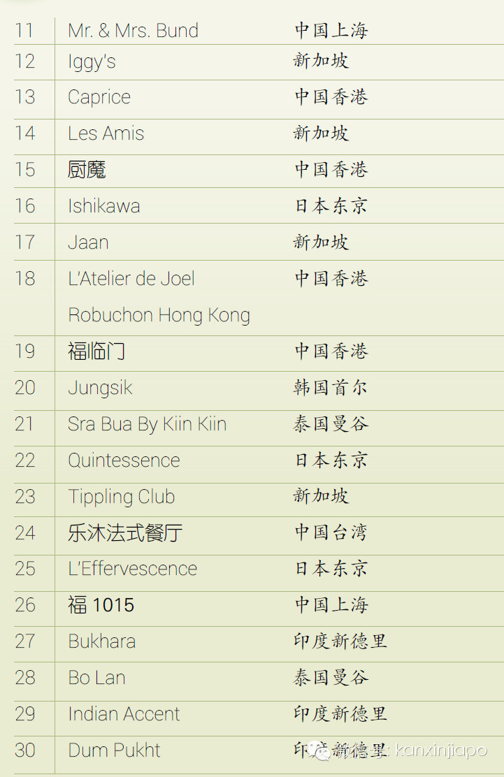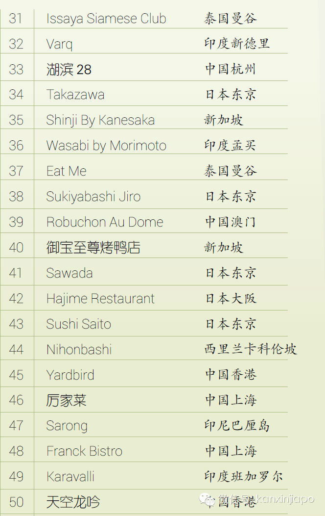令人遗憾的是,尽管中国餐厅占据了榜单近三分之一,却没有一家来自北京。排名第48的Franck Bistro来自上海,排名第33的湖滨28位于杭州,而排在第9位的龙景轩和第39位的Robuchon Au Dome,则分别来自香港和澳门。在新入榜餐厅中,也有三家中国餐厅,分别是位于台中的乐沐法式餐厅(第24名)和位于香港会议中心的天空龙吟(第50名)。看起来最能体现皇城特色的厉家菜,其上榜的依然是位于上海的餐厅,排在第46位。