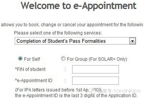 完成付款之后,ICA会在7个工作日之内给学校发信,童鞋们就开始等PM给你邮件吧。接到PM邮件,我们还需要在网上预约办理新的学生证的时间。网址是eappointment.ica.gov.sg ,点击进入后,你会看见一个对话框,点击选择Completion of student’s pass Formalities,选择好以后,系统会自动跳转对话框,输入学生证号码和ICA信里面写着的那个e-Appointment ID的后三位,完成后点Submit,然后你就可以选日期了,最近ICA很忙,一般最早也要在你选日期后的2~3个星期才有空位(我的就是等了1个月,已经超出了白卡的期限了)。