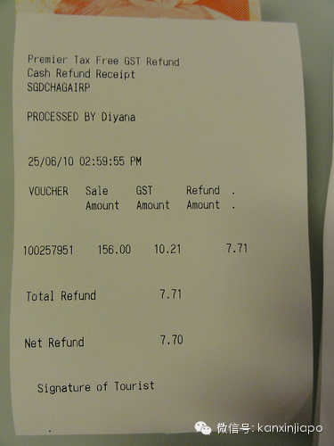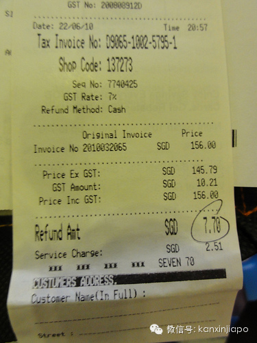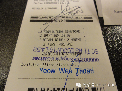 会列出退税金额还有服务收取的费用。新加坡的消费税是7%,但是扣除服务费后大概可以拿到5%左右。另外,很重要的一点。店家必须在这张退税凭证上签名。不然没有签名到机场就欲哭无泪了,尤其是金额很大者。