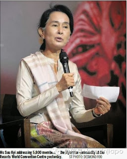 (2013年9月22日初访新加坡的翁山淑枝,在圣淘沙Resort World对5800名缅甸侨民发表演说。Straits Times,September 23, 2013)