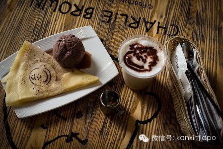 因为中午已经吃过饱饱的一餐,所以只点了可丽饼配巧克力冰淇淋,以及冰拿铁。如果在乌节路逛街逛到腿酸,这里真的是个放松心情的好去处呢!