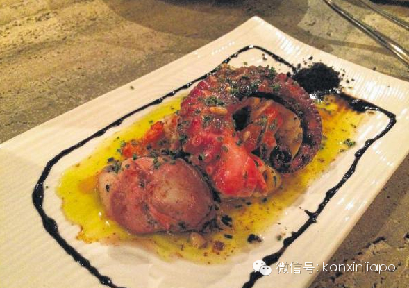 香煎鹅肝搭配金瓜奶油(Ficato Di Sette Cannola $28)让人惊喜,可以想象鹅肝在金瓜奶油融化的滋味吗?醒目的亮黄金瓜奶油浓稠而甜蜜,让鹅肝的丰腴升级。章鱼鲜虾沙拉(Polipo e Gamberi,$28)以有气矿泉水真空烹调,表达了厨师呵护食材的用心。