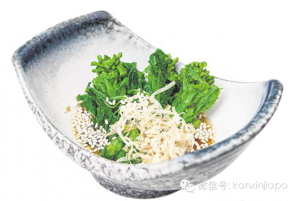 春季是新芽初长,翠绿回归的时刻,师傅送上的前菜就有丰富的绿意。新鲜竹笋经过调料微微腌制再轻烤,吃的是难得的爽脆口感。竹笋清鲜洗涤口腔,一嘴轻盈。菜花(Nanohana)是日本初春的代表性蔬菜,它其实是油菜籽的新芽。师傅用柴鱼昆布高汤佐以酱油,咸咸酱汁和微苦的菜花交织成一个本地时蔬没有的鲜味。