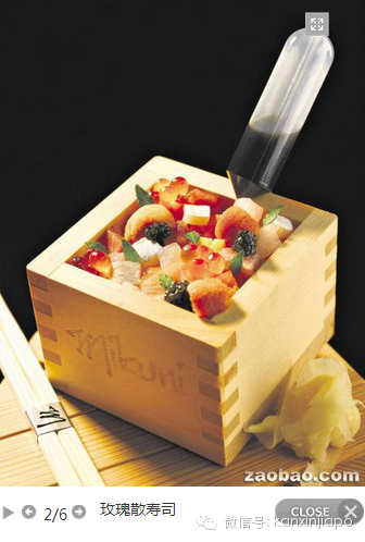 材料:鲔鱼腹(Toro)50克、鲔鱼50克、鲑鱼50克、黄尾鱼50克、煎蛋50克、寿司饭180克、鲑鱼卵1汤匙、海胆20克、鱼子酱1茶匙、芝麻1茶匙(烤过)、酱清40毫升、山椒叶16小枝、腌制姜10克。