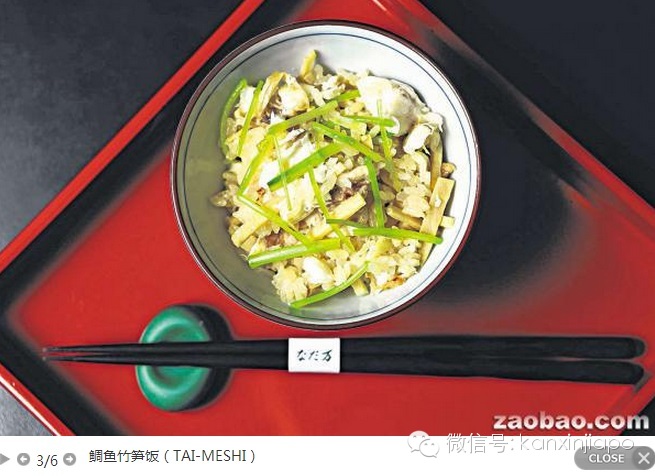 七、饭煮熟后,鲷鱼去骨混入饭中。盛入碗里后,再缀以日本香菜。