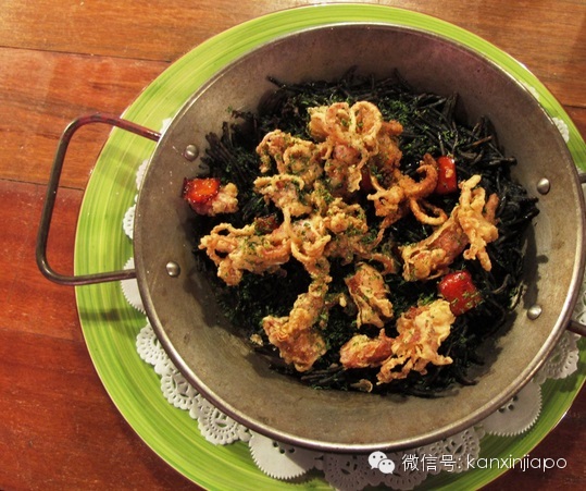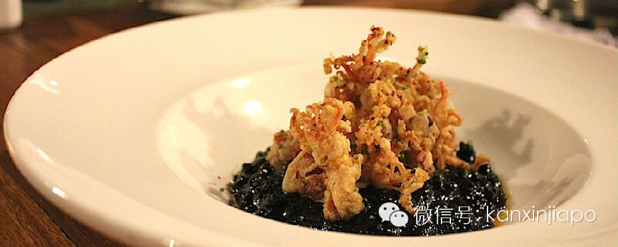 上桌时香气逼人,面条的口感与一般墨汁意大利面al dente的口感相去甚远,这种短面条极为香脆,有点像是生面的口感。原来Chavez先以烤的方式治理,再以墨汁、番茄、白酒及鱼汤烹煮,油炸鱿鱼和烤鱿鱼两种口感一酥脆一嫩口。