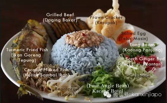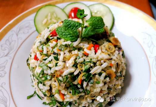 沙律饭的饭粒可呈绿、蓝、红、黄,甚至是黝黑等颜色,由所使用的香料而定。佐料有黄姜、香茅、豆芽、洋葱、黄瓜、鱼肉碎等。配叁峇辣酱一块儿吃,真是让人味蕾体验多重口感。