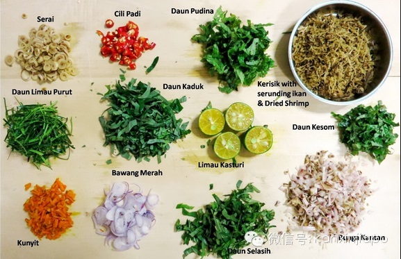 通常什锦饭都会配烤鱼、炸鱼饼、咸蛋、腌蒜等,而Budu鱼酱是必要的,否则就称不上是Kerabu。同时,如果要体验更原始的吃法,可以考虑吃一盘生菜饭(Nasi Ulam,Ulam是指可以生吃的蔬菜),白饭配数种生菜,是最简单,却是最健康的马来吃法。