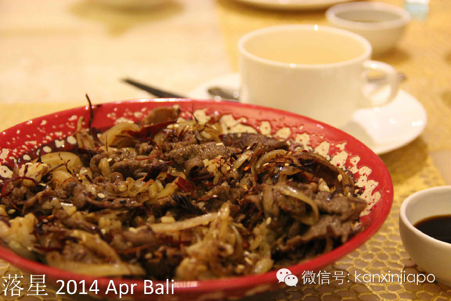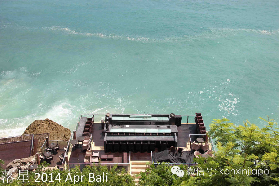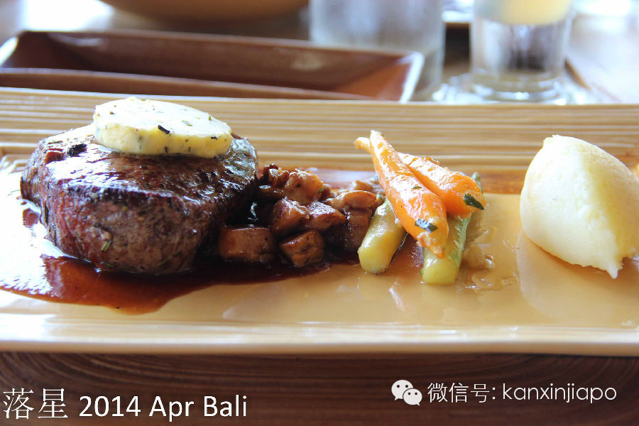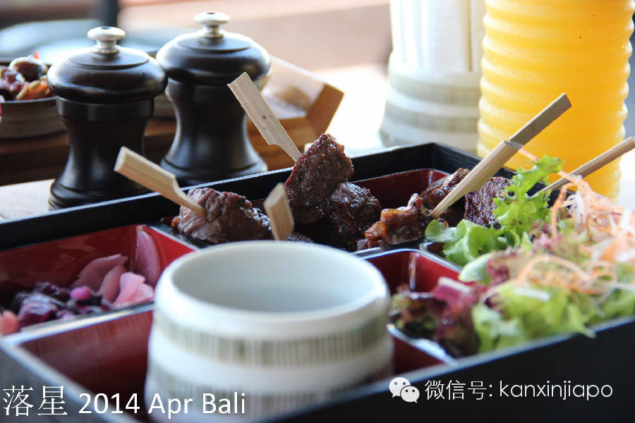 在这里我们只是点了一份简单的Bento,不过却阴差阳错的吃到了有生以来最好吃的和牛牛肉。看起来不过简单的牛肉块串串,不过吃到嘴里嫩的仿佛立刻就能化掉,咬一口鲜嫩的汁水在口腔里横流。这一刻终于理解了肉在嘴里融化的感觉,美丽的海景都变得可有可无了(容我再回味一下)。一份牛肉要350000印尼盾(约40新币),不过肉这么好吃贵点儿也值得了。在我们吃饭的时候,我家女主一直在说旁边我们店旁边的T型台很眼熟。像是杨幂结婚的地方,我看了看那个小台子下意识就直接否定了。那么小的台子才能站几个人,亲友团都没有地方看婚礼。结果她在网上搜了一下杨幂婚礼的照片,肯定的告诉我就是这个不起眼的小T台。我默默看了看那小台子,看了看网络上的婚礼照片,心里突然发现结婚时候照相和摄像一定要请优秀专业人员呀,尼玛这小台子居然可以拍的这么高大上。