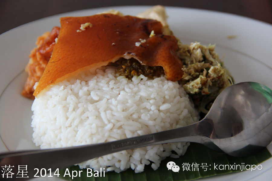 到了乌布的第一站,我们就决定先去犒劳自己的肚子,就来到了最有名气的脏鸭饭。走进了店里,我们突然觉得是不是走错,因为这更像一个公园而不是餐馆。到处都是树林,凉亭,以及盛开的花朵。稍远处就是成片的刚刚种下稻苗的水稻田。餐桌就零零散散补布置在一个个位于林间的小凉亭里。在这样的环境下吃饭心情想要不好都很难,除非你忘记带防蚊喷雾。脏鸭饭的鸭子是烤制的,皮很脆,鸭肉里的水分也几乎都被烤光了。咬下去酥酥脆脆的同时还有些鸭子油。附餐的还有三种不同蘸料,都是本地的蔬菜草药配制的,吃起来很特别。不过个人还是觉得不蘸料的鸭子吃起来最香。一餐大概是330000印尼盾。