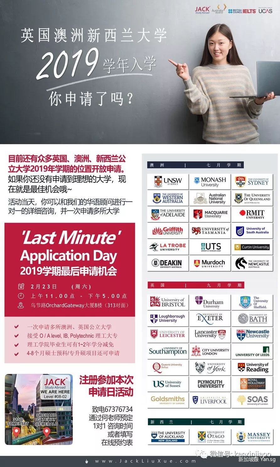你还没有得到一张公立大学的入学通知书?新加坡杰克留学将在2019年2月23日(周六)在索美塞的OrchardGateway大楼8楼开办”2019学年澳洲英国大学 最终申请日”活动。这是申请2019学年英国、澳洲、新西兰公立大学的最好(也是最后)机会。你可以申请: