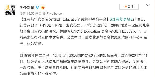 今天(2月10日),中国媒体曝出,红黄蓝幼儿园以1.25亿人民币的价格,收购了新加坡某私立儿童教育机构近70%的股权。同时名字也从“RYB Eduction” 改为 “GEH Education”。